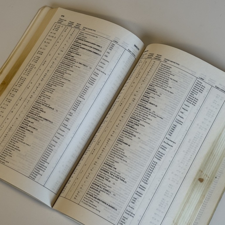 Opmerkingen: Lichte beschadigingen aan de kaft, sporen van gebruik aan binnenzijde (enkele vlekken), verder compleet. Bevat alle nummer 1-hits, alarmschijven en uitgebreide lijsten van 1945 t-m 1990. Populair referentieboek.