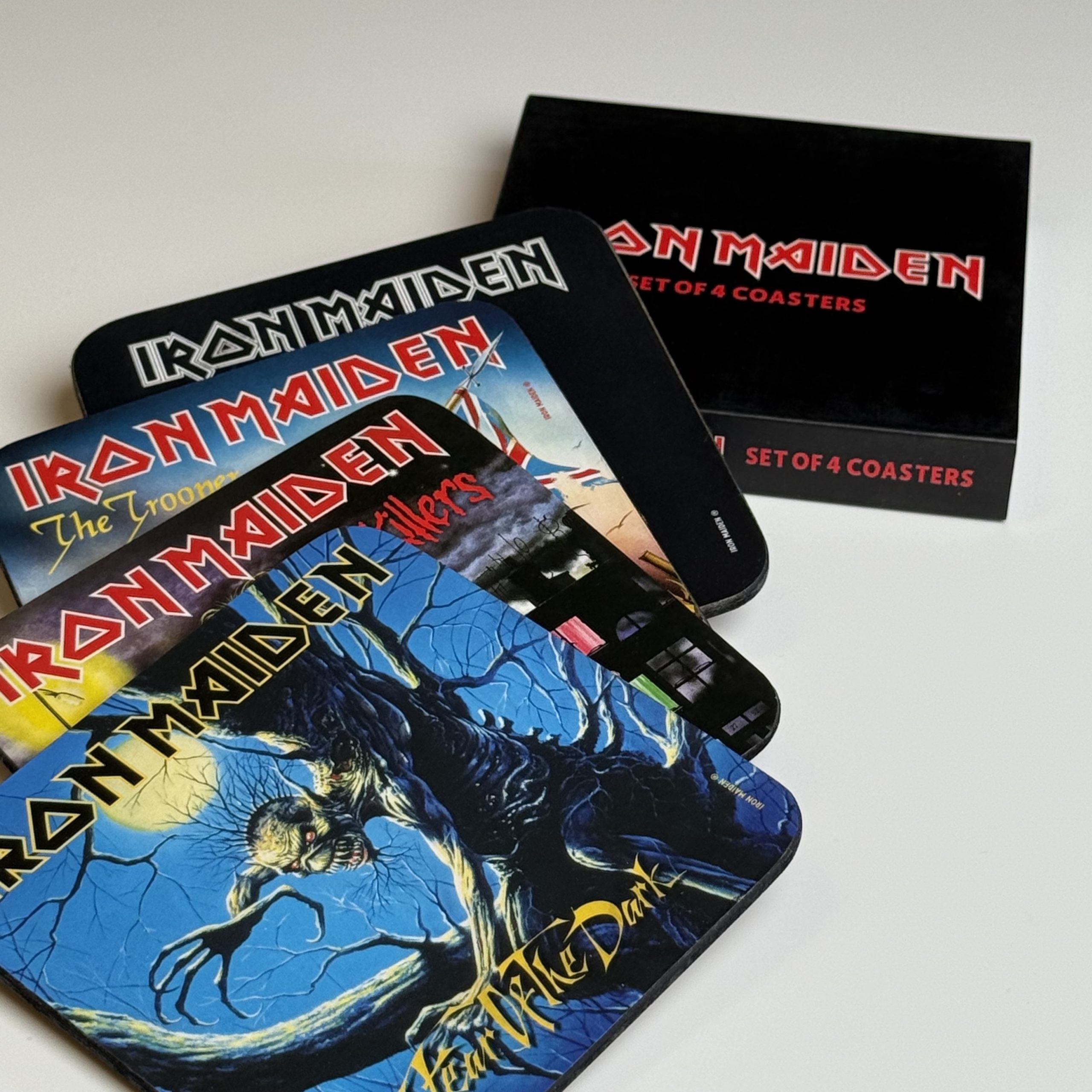 Rock je tafel met deze stoere onderzetters ban Iron Maiden, elk bedrukt met een iconische afbeelding. perfect voor elke fan!