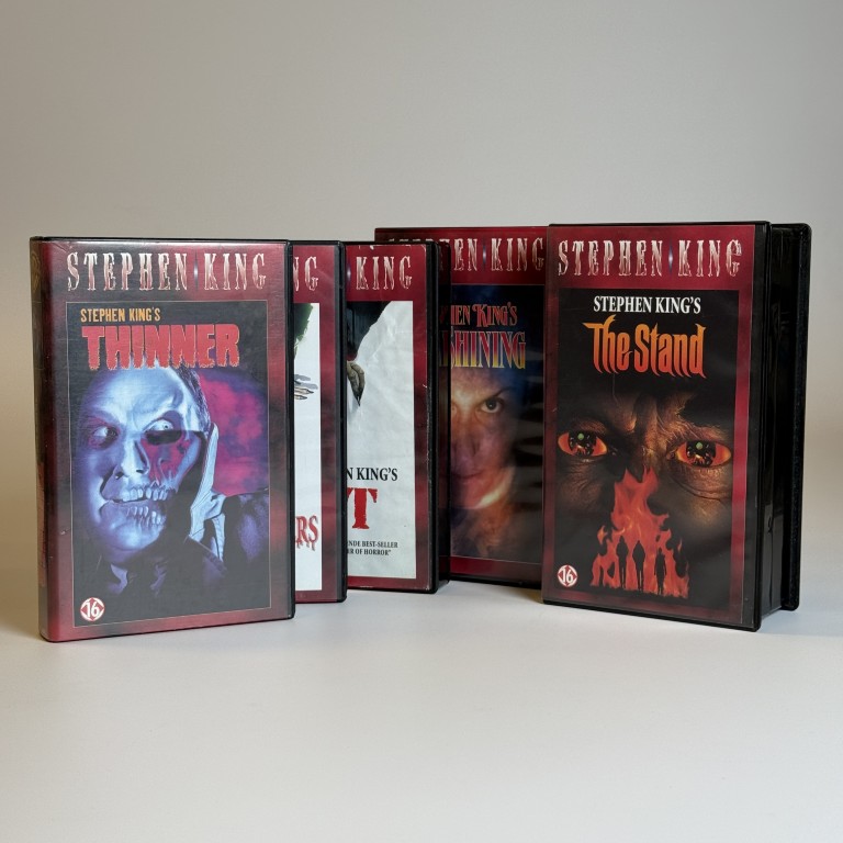 Deze originele VHS-collectie brengt de duistere wereld van Stephen King terug naar de jaren ’90, toen huiskamers nog gevuld waren met het zoemende geluid van videorecorders.