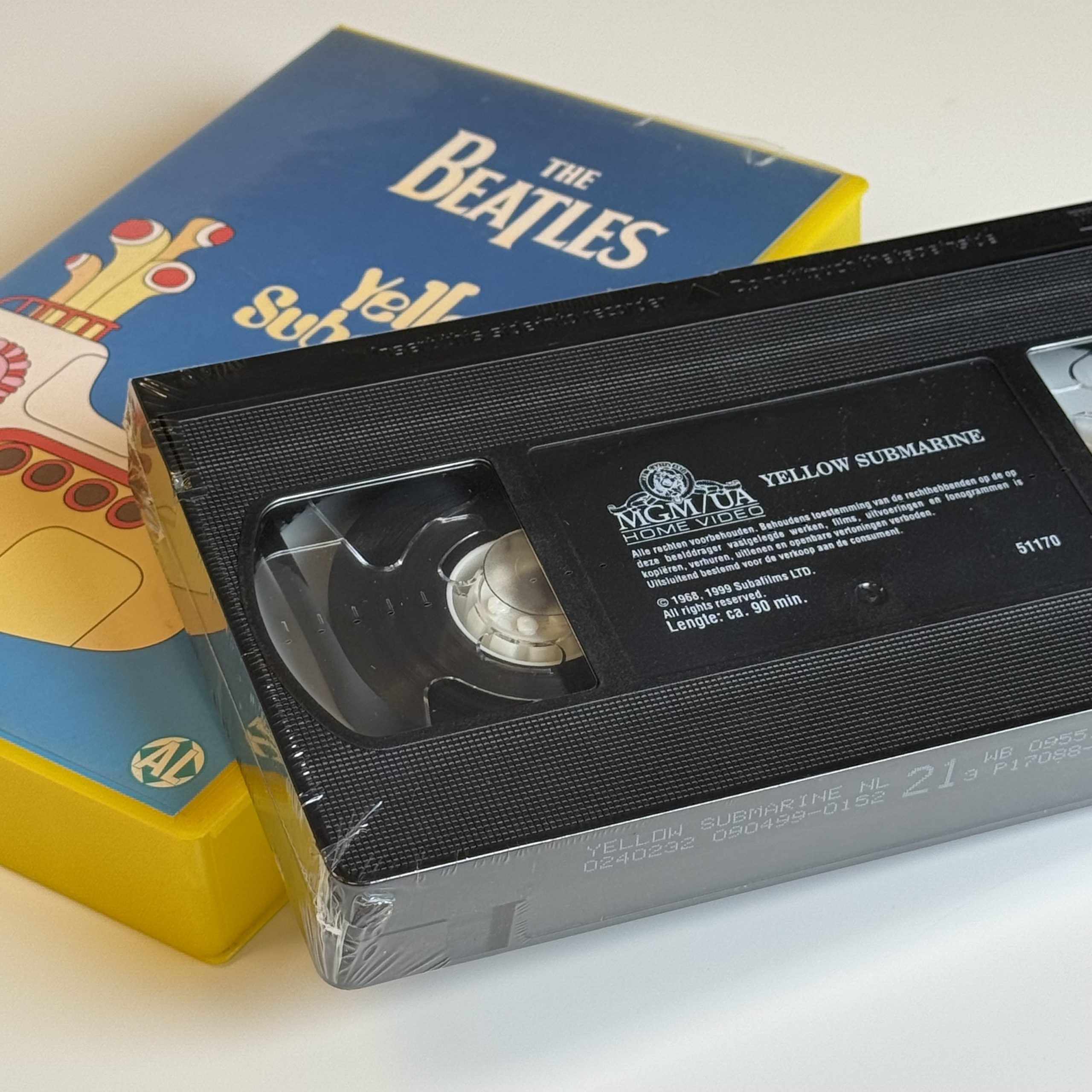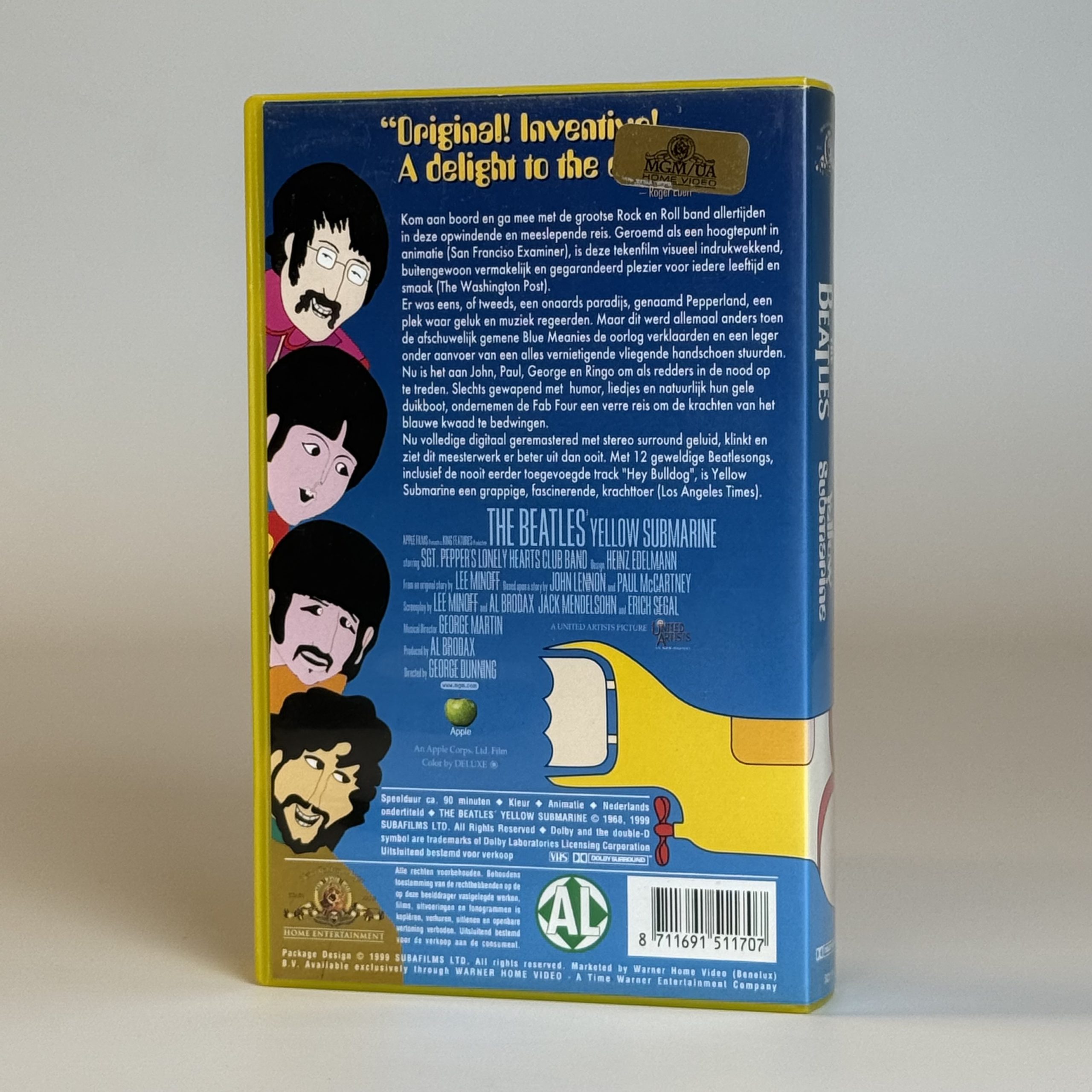 Een originele uitgave van yellow submarine op vhs, de iconische animatiefilm waarin the beatles de strijd aangaan met de blue meanies in het fantasierijke pepperland. Deze nederlandse versie werd uitgegeven door mgm home video en is uitgevoerd met een opvallende gele hoes.